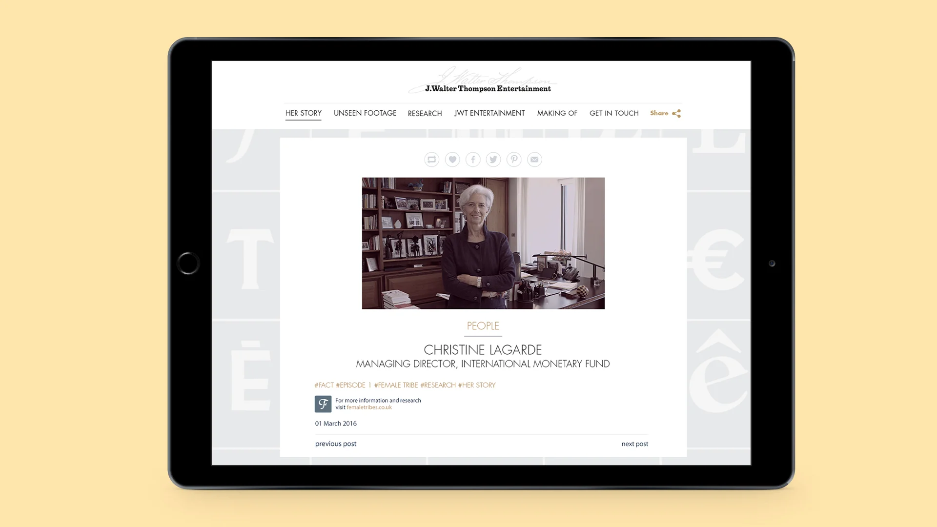 I was in charge of designing the responsive website that would celebrate, and house all the Her Story supporting content, as well as inform users about J.Walter Thompson Entertainment. I kept the layout and colours simple and elegant, referencing editorial publishing. The use of a modular format with bite-sized information allows for the content to stand out on all devices. The copy and links have a clear hierarchy, so that users can easily navigate the site. I used the Female Tribes logo as a pattern in the background, as distinctive branding and to symbolise diversity.